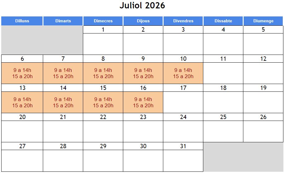 Horari: Presencial de dilluns a divendres de 9:00 a 20:00h (L'horari de les sessions online seran de lliure elecció per l'alumne/a. La data límit per presentar la part Online és l'últim dia de curs.) Data inici: 6 de juliol de 2026 Data finalització: 16 de juliol de 2026 Lloc: Aula Escola de Monitors; Carrer Pallars, 390, 08019 Barcelona + ONLINE Promoció Amics: Porta 2 amics o més i cadascun de vosaltres gaudirà d'un descompte directe de 30 € per persona. **Per activar aquesta oferta en el formulari d'inscripció al teu curs, has d'introduir els noms i cognoms dels teus amics. |