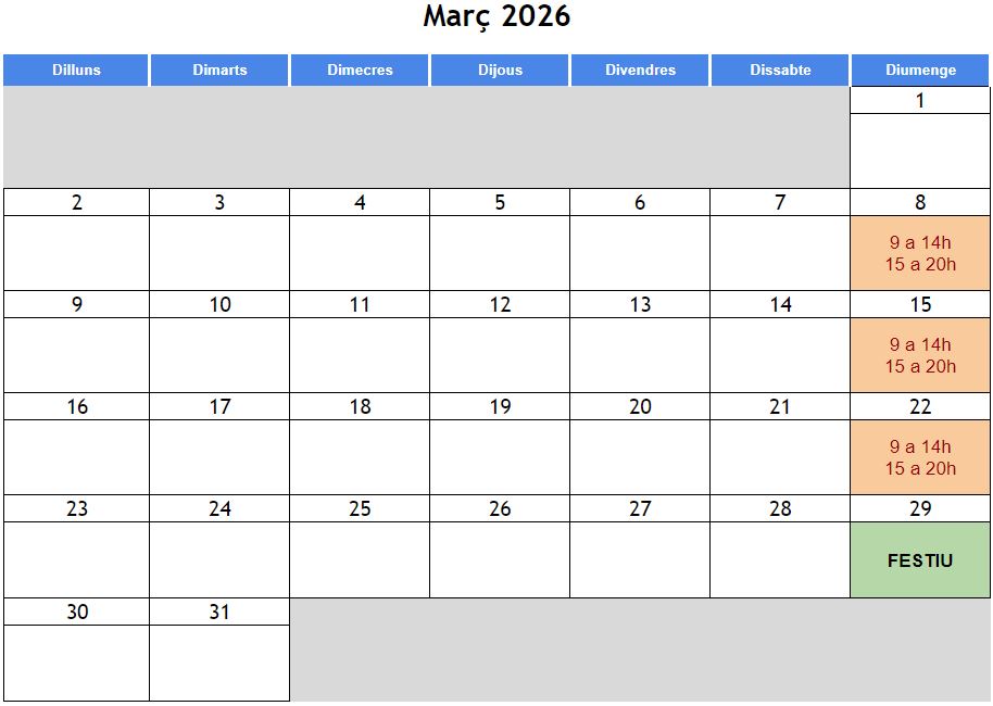Horari: diumenges presencials de 9:00 a 20:00h (L'horari de les sessions online seran de lliure elecció per l'alumne/a. La data límit per presentar la part Online és l'últim dia de curs.) Data inici: 8 de març de 2026 (Festiu el diumenge 29 març i 5 d'abril) Data finalització: 17 de maig de 2026 Lloc: Aula Escola de Monitors; Carrer Pallars, 390, 08019 Barcelona + ONLINE Promoció Amics: Porta 2 amics o més i cadascun de vosaltres gaudirà d'un descompte directe de 30 € per persona. **Per a poder gaudir d’aquesta oferta, serà necessari enviar-nos un correu amb els noms dels teus amics abans d’inici la formació. |