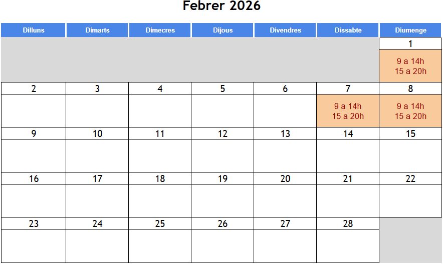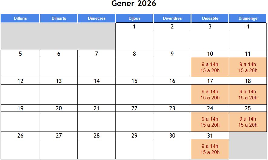 Horari: dissabtes i diumenges de 9:00 a 20:00h Data inici: 10 de gener de 2026 Data finalització: 8 de febrer de 2026 Modalitat: Semi-presencial Lloc: Aula Escola de Monitors; Carrer Pallars, 390, 08019 Barcelona |