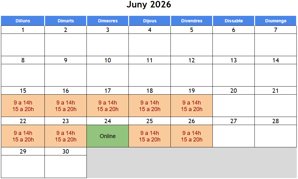 Horari: de dilluns a divendres de 9:00 a 20:00h (La classe del 24 de juny serà Online) Data inici: 15 de juny de 2026 Data finalització: 26 de juny de 2026 Modalitat: Semi-presencial Lloc: Aula Escola de Monitors; Carrer Pallars, 390, 08019 Barcelona |