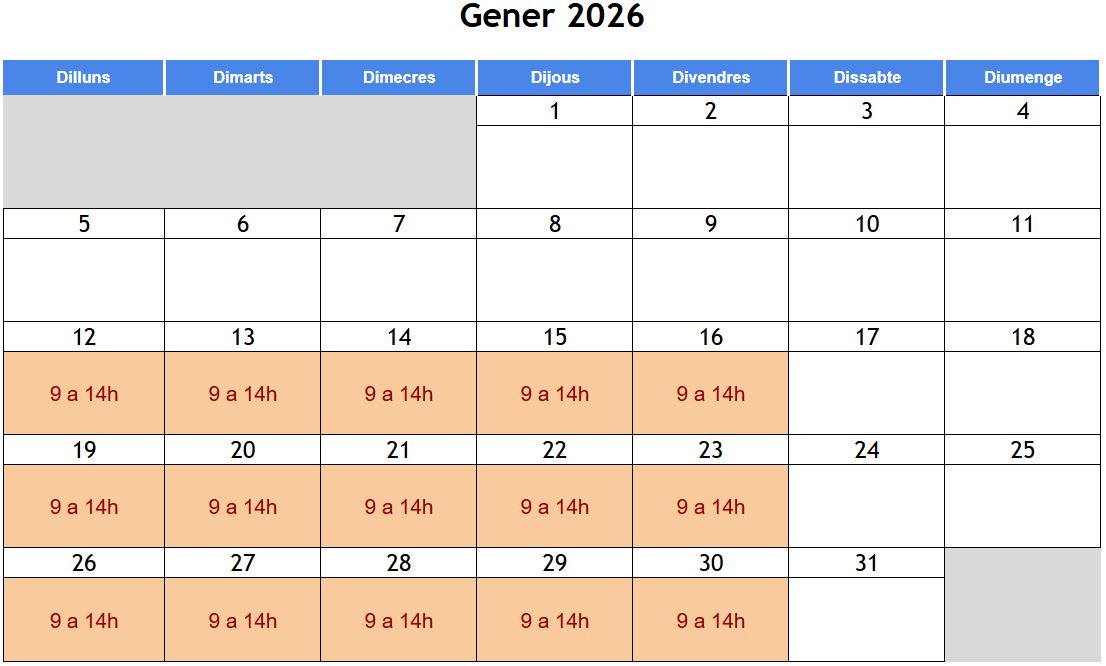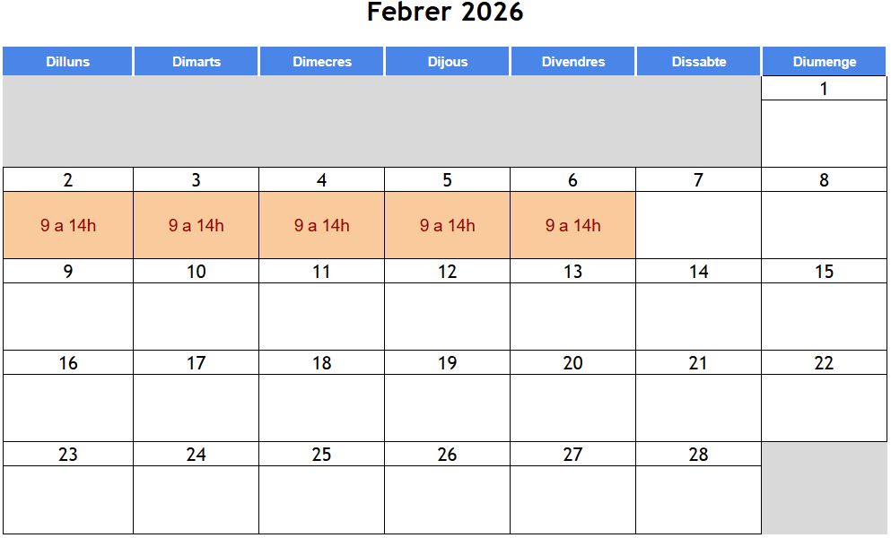 Horari: de dilluns a divendres de 9:00 a 14:00h Data inici: 3 de novembre de 2025 Data finalització: 28 de novembre de 2025 Modalitat: Semi-presencial Lloc: Aula Escola de Monitors; Carrer Pallars, 390, 08019 Barcelona |