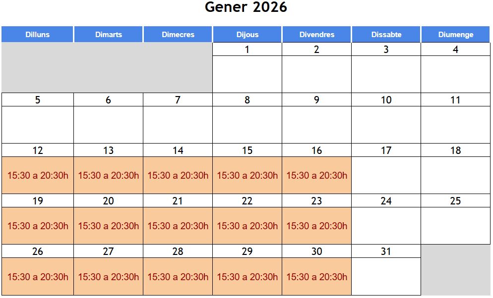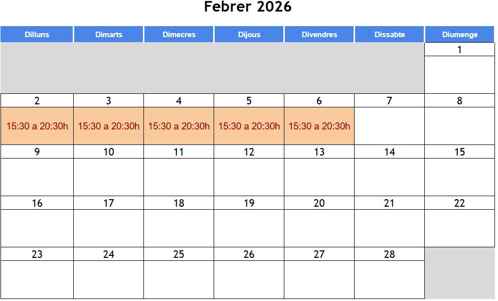Horari: de dilluns a divendres de 15:30 a 20:30h Data inici: 12 de gener de 2026 Data finalització: 6 de febrer de 2026 Modalitat: Semi-presencial Lloc: Aula Escola de Monitors; Carrer Pallars, 390, 08019 Barcelona |