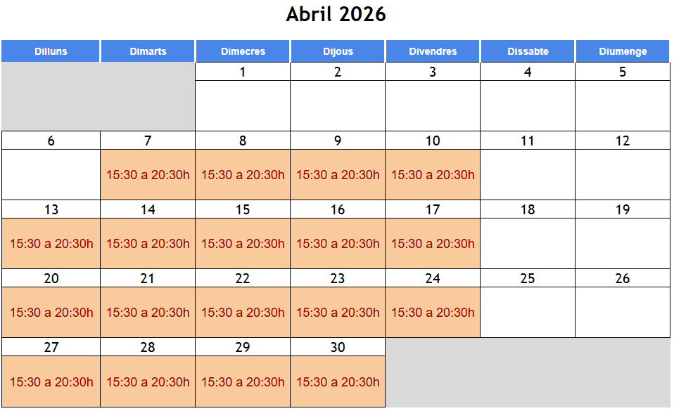Horari: dilluns a divendres de 15:30h a 20:30h Data inici: 7 d'abril de 2026 Data finalització: 1 de maig de 2026 Modalitat: Semi-Presencial (Curs Monitor/a de lleure) 100% Online (Curs de Vetllador/a + NESE)Lloc: Aula Escola de Monitors; Carrer Pallars, 390, 08019 Barcelona (Matricula't ara i obtindràs de franc la samarreta oficial de l'Escola) Veure samarreta |