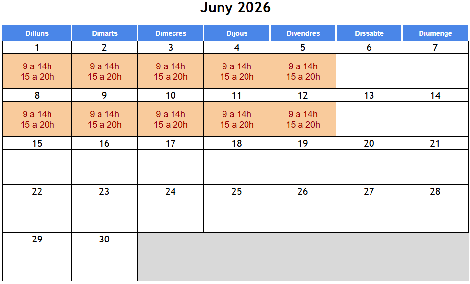 Horari: dilluns a divendres de 9:00h a 20:00h Data inici: 1 de juny de 2026 Data finalització: 12 de juny de 2026 Modalitat: Semi-Presencial (Curs Monitor/a de lleure) 100% Online (Curs de Vetllador/a + NESE)Lloc: Aula Escola de Monitors; Carrer Pallars, 390, 08019 Barcelona (Matricula't ara i obtindràs de franc la samarreta oficial de l'Escola) Veure samarreta |